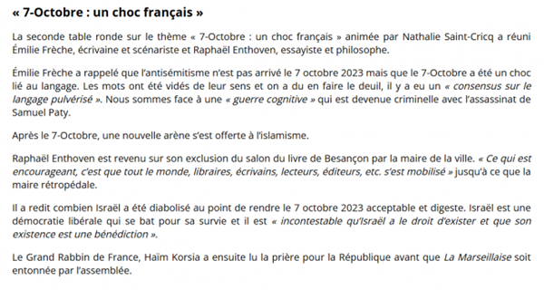 Que vient faire la directrice des rédactions nationales de France Télévision dans cette soirée communautaire, qui plus est, religieuse ? N’a-t-elle pas un devoir de neutralité et de laïcité ? Est-ce une pige, et dans ce cas c’est répréhensible, ou, pire, est-ce un choix personnel ? Sait-elle qu’elle est payée par les Français sans précision de confession, et que des chrétiens ou des musulmans peuvent trouver son choix au mieux symbolique, au pire politique, car en plein génocide ?