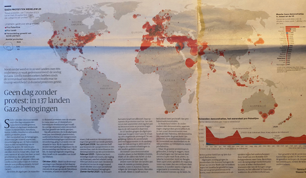 Photo d’illustration : «Gaza manifestations dans le monde entier», Volkskrant, article version papier, 7 octobre 2025. Source : Acled, analyse de Volkskrant. Données jusqu’au 26 septembre inclus. Source des données cartographiques : Natural Earth.