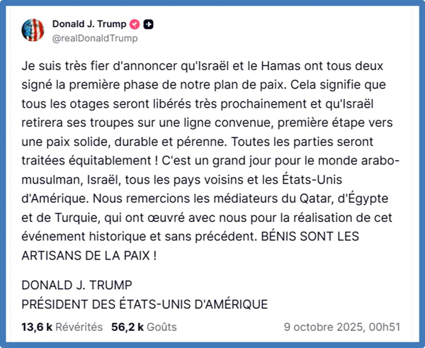 « Je suis très fier d’annoncer qu’Israël et le Hamas ont tous deux signé la première phase de notre plan de paix. Cela signifie que TOUS les otages seront libérés très prochainement et qu’Israël retirera ses troupes sur une ligne convenue, première étape vers une paix solide, durable et éternelle », a écrit Trump sur Truth Social. « BÉNIS SONT LES ARTISANS DE LA PAIX ! »