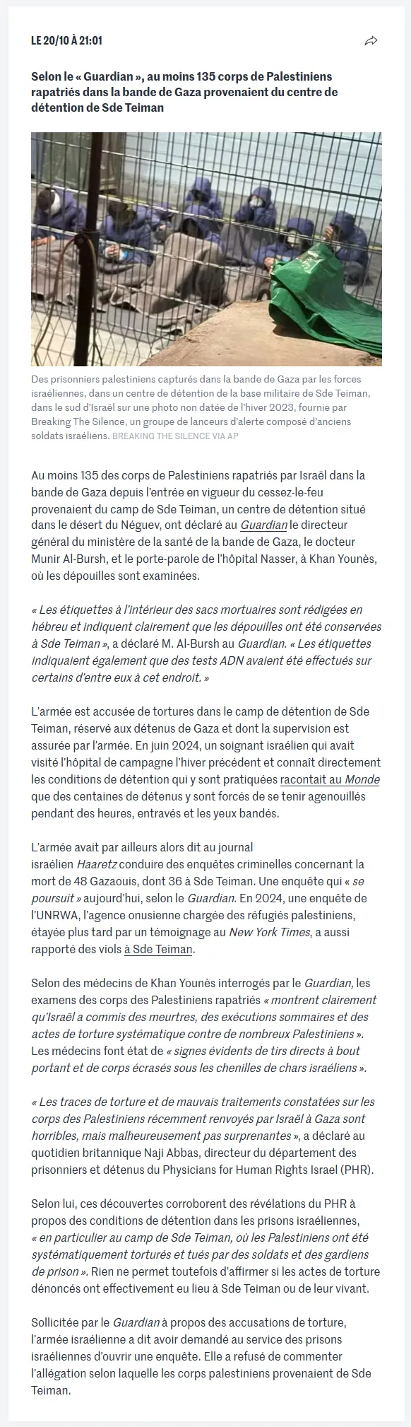 Concernant les abus présumés à Sde Teiman et les actes de torture infligés aux prisonniers, l’armée israélienne a précédemment déclaré qu’elle traitait les détenus «de manière appropriée et avec soin» et que «toute allégation de faute commise par des soldats de l’armée israélienne est examinée et traitée en conséquence. Dans les cas appropriés, des enquêtes criminelles sont ouvertes par la police militaire».