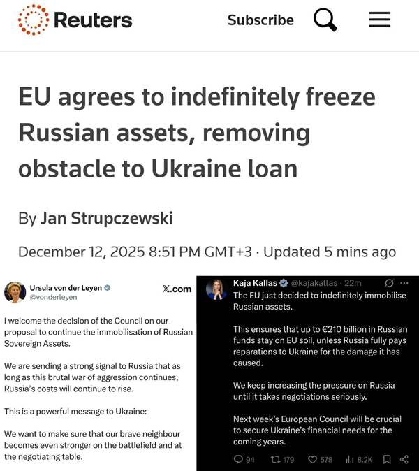 Le même jour, la mafia bruxelloise a franchi l’ultime étape de son autodestruction en votant illégalement pour modifier la condition d’unanimité concernant la restitution des «avoirs gelés» russes, afin de les geler indéfiniment et de servir de filet de sécurité aux «réparations» ukrainiennes. Elle a procédé ainsi en invoquant une clause relative aux «urgences économiques», prétextant en substance que l’UE subit de graves dommages économiques du fait de la «guerre menée par la Russie».