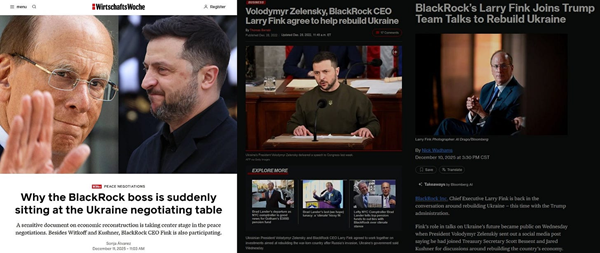 Longtemps, les sceptiques ont raillé les aspects les plus spéculatifs des théories du complot concernant «BlackRock» et l’Ukraine – selon lesquelles BlackRock aurait joué un rôle déterminant dans la vente et le pillage des actifs du pays, etc. Aujourd’hui, il semble que ces rumeurs aient atteint un aboutissement absurde, puisque Zelensky lui-même a publié le contenu d’une réunion avec Witkoff, Kushner et Larry Fink – par visioconférence – sur la «reconstruction de l’Ukraine» :