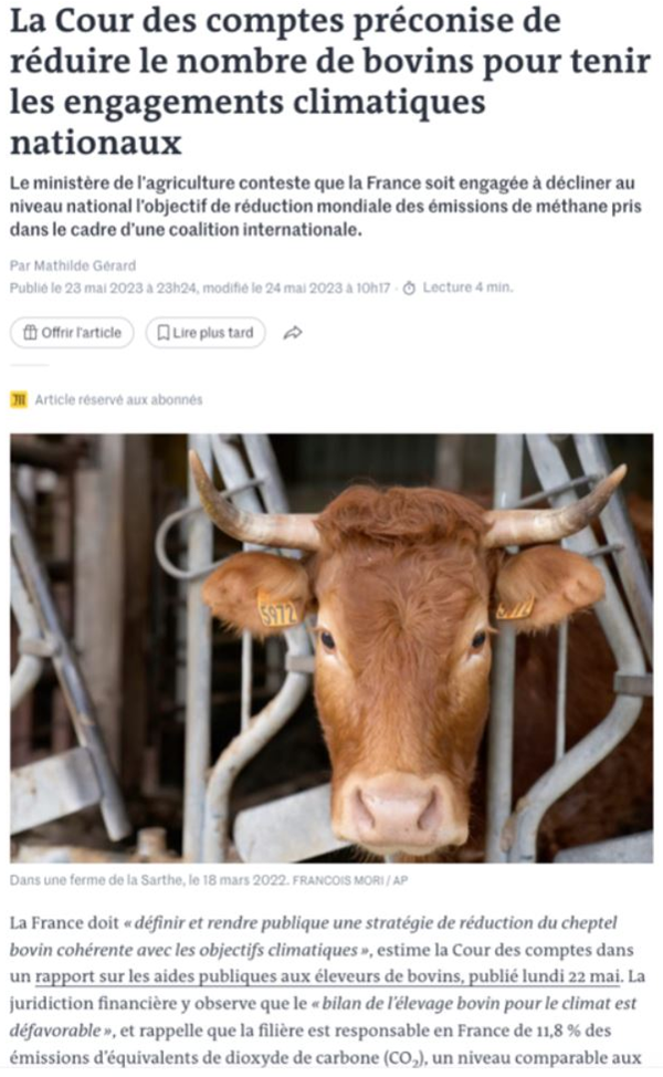 - La Cour des comptes préconise depuis 2023 la réduction du cheptel bovin en France au nom de la «raison climatique» :