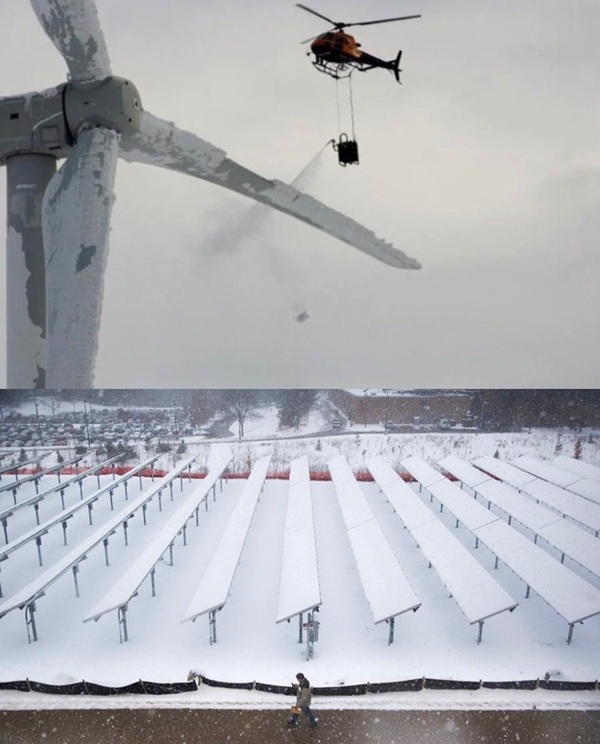 Les éoliennes gelées illustrent un problème majeur des énergies renouvelables, sans oublier les panneaux photovoltaïques recouverts de neige ! On a tous vu l’hélicoptère dégivrer les pales d’une éolienne dans une image devenue virale. Pourtant la demande d’énergie explose lors des vagues de froid. Pire, le vent faiblit souvent en anticyclone hivernal.