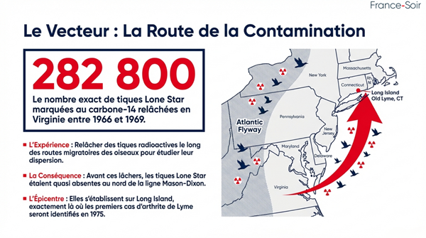 1966-1969 : 282 800 tiques « lone star » marquées au carbone-14 relâchées en Virginie le long des routes de migration des oiseaux (Atlantic Flyway). Des populations se sont ensuite établies sur Long Island – exactement là où les premiers cas de Lyme ont été identifiés en 1975.