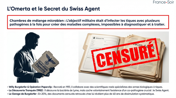 Des scientifiques clés comme Willy Burgdorfer (recruté en 1951 pour la instrumentalisation des tiques) découvre la Borrelia burgdorferi en 1982 mais omet volontairement de publier sur le « Swiss Agent » (Rickettsia helvetica), un co-pathogène qui pourrait expliquer les formes chroniques sévères. Le recrutement, via l’Operation Paperclip, de scientifiques nazis comme Erich Traub, spécialiste des armes biologiques à tiques qui collabore à Plum Island.
