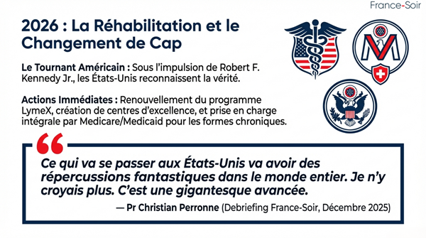 Le 16 décembre 2025, dans un debriefing vidéo pour FranceSoir, le Pr Perronne salue avec un « immense moment de joie » les annonces américaines de Robert F. Kennedy Jr. (alors secrétaire à la Santé) : renouvellement du programme LymeX, création de centres d’excellence, études pédiatriques du NIH, page dédiée sur hhs.gov/lyme et meilleure prise en charge par Medicare/Medicaid. Il déclare : « Ce qui va se passer aux États-Unis va avoir des répercussions fantastiques dans le monde entier. Je n’y croyais plus. C’est une gigantesque avancée. »