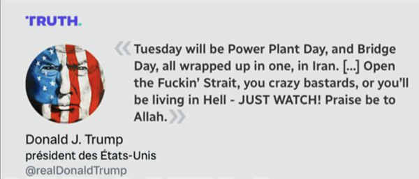 Le dimanche de Pâques, 5 avril 2026, le président des États-Unis Donald Trump a publié un message ordurier sur sa plateforme Truth Social, annonçant que mardi serait le « jour des centrales électriques » et le « jour des ponts » en Iran si le détroit d’Ormuz demeurait fermé.