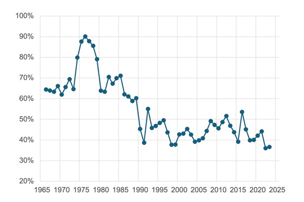 Avant de baisser progressivement à partir des années 1980, pour atteindre 37 % en 2023, la dernière année disponible.