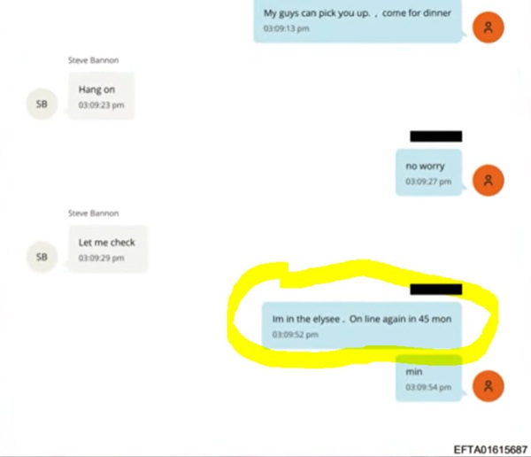 Un échange par textos entre Jeffrey Epstein et Steve Bannon contient ce message d’Epstein ; « Je suis à l’Elysée. » Une heure et demi plus tard, Epstein écrit à Steve Bannon « Maintenant à la pyramide avec l’ensemble du Gouvernement ». Bannon répond : « Le gouvernement Macron ? » Epstein réagit : « Oui », « Les ministres de l’élite ».