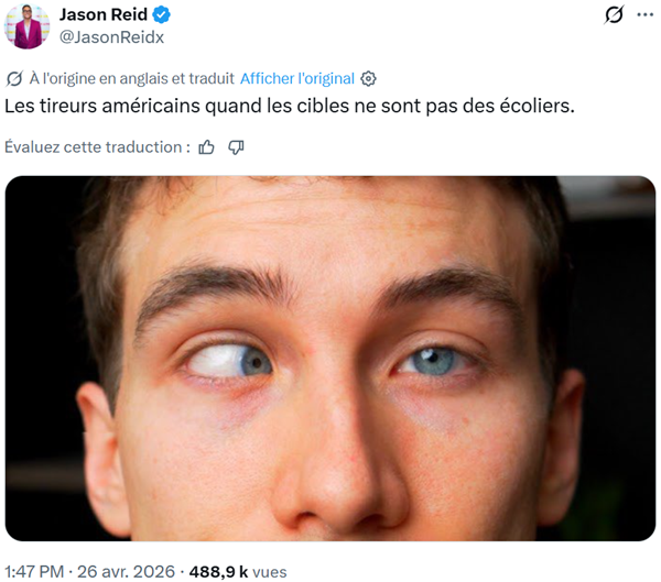 Le Président n’est pas touché, il n’était même pas visé : les tirs provenaient de l’entrée du gala et visaient un membre du service d’ordre. Aussitôt, montrant toute sa confiance dans la vie et dans Jésus Christ le Sauveur et l’Éternel, Donald reprit le cours de la conversation, alors que n’importe quel humain normal aurait tremblé de peur. Il a même raconté que cet attentat ne l’empêcherait pas de reprendre la guerre contre l’Iran. Ça, c’est de la couille dure ! Que notre Macron en prenne de la graine. En même temps, il n’a subi aucun attentat. Il est vrai qu’avec un personnel de sécurité de cent personnes, c’est une entreprise plutôt difficile pour un Gilet jaune désarmé et désespéré.