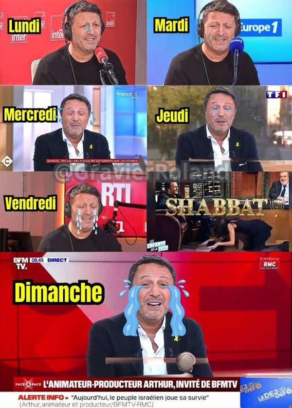 En tant que multimillionnaire (à la tête de 300, 400 ou 500 millions, estimation basse), en tant qu’animateur, en tant que producteur, mais aussi en tant que juif, Arthur est invité partout, même sur le service public. On l’a vu raconter devant la carpette Devillers sur France Inter qu’il souffrait de harcèlement sur les réseaux sociaux, et qu’un garde du corps le suivait en permanence, alors qu’objectivement, personne ne veut attenter à sa vie.