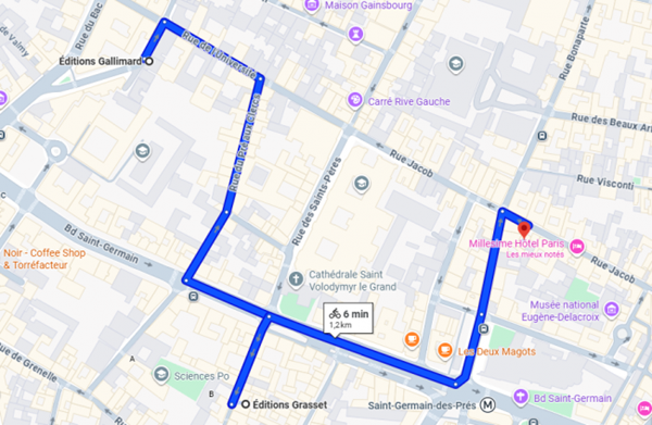 Entre-temps (en 2010), Le Seuil a déménagé dans le XIXe (la honte), mais son adresse historique était au 27 rue Jacob, dans le glorieux VIe, et là on a bien notre triangle d’or. Ah, Saint-Germain-des-Prés, que de souvenirs…