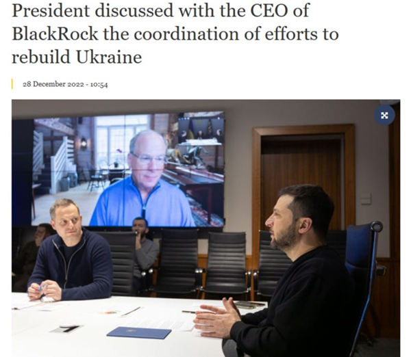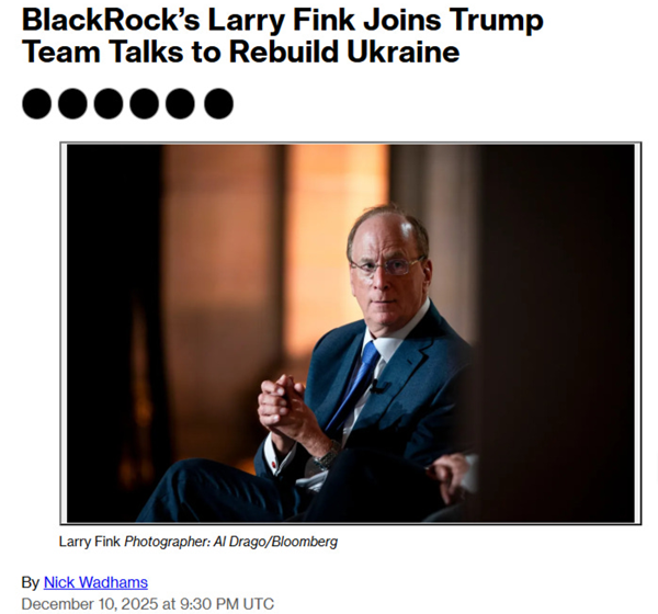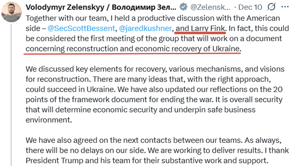 Longtemps, les sceptiques ont raillé les aspects les plus spéculatifs des théories du complot concernant «BlackRock» et l’Ukraine – selon lesquelles BlackRock aurait joué un rôle déterminant dans la vente et le pillage des actifs du pays, etc. Aujourd’hui, il semble que ces rumeurs aient atteint un aboutissement absurde, puisque Zelensky lui-même a publié le contenu d’une réunion avec Witkoff, Kushner et Larry Fink – par visioconférence – sur la «reconstruction de l’Ukraine» :