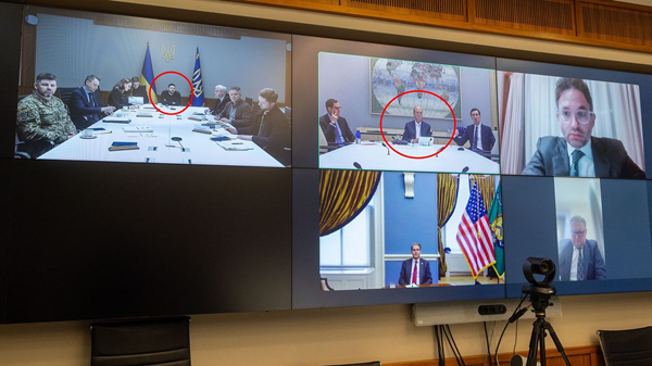 Voici le message en question publié par Zelensky sur les réseaux sociaux, Fink supervisant le déroulement de l’appel vidéo :