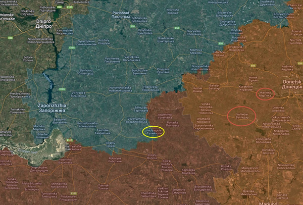 Sur cette vue élargie, on peut constater le chemin parcouru par les forces russes depuis Vugledar et Marinka, qui semblent pourtant si proches :