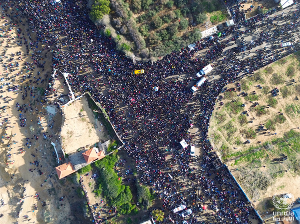 Photo aérienne de Palestiniens déplacés attendant dans le nord de Nuseirat de pouvoir rentrer chez eux à Gaza le 6 janvier. (Ashraf Amra/Office de secours et de travaux des Nations unies pour les réfugiés de Palestine dans le Proche-Orient/Wikimedia Commons/ CC BY-SA 4.0)