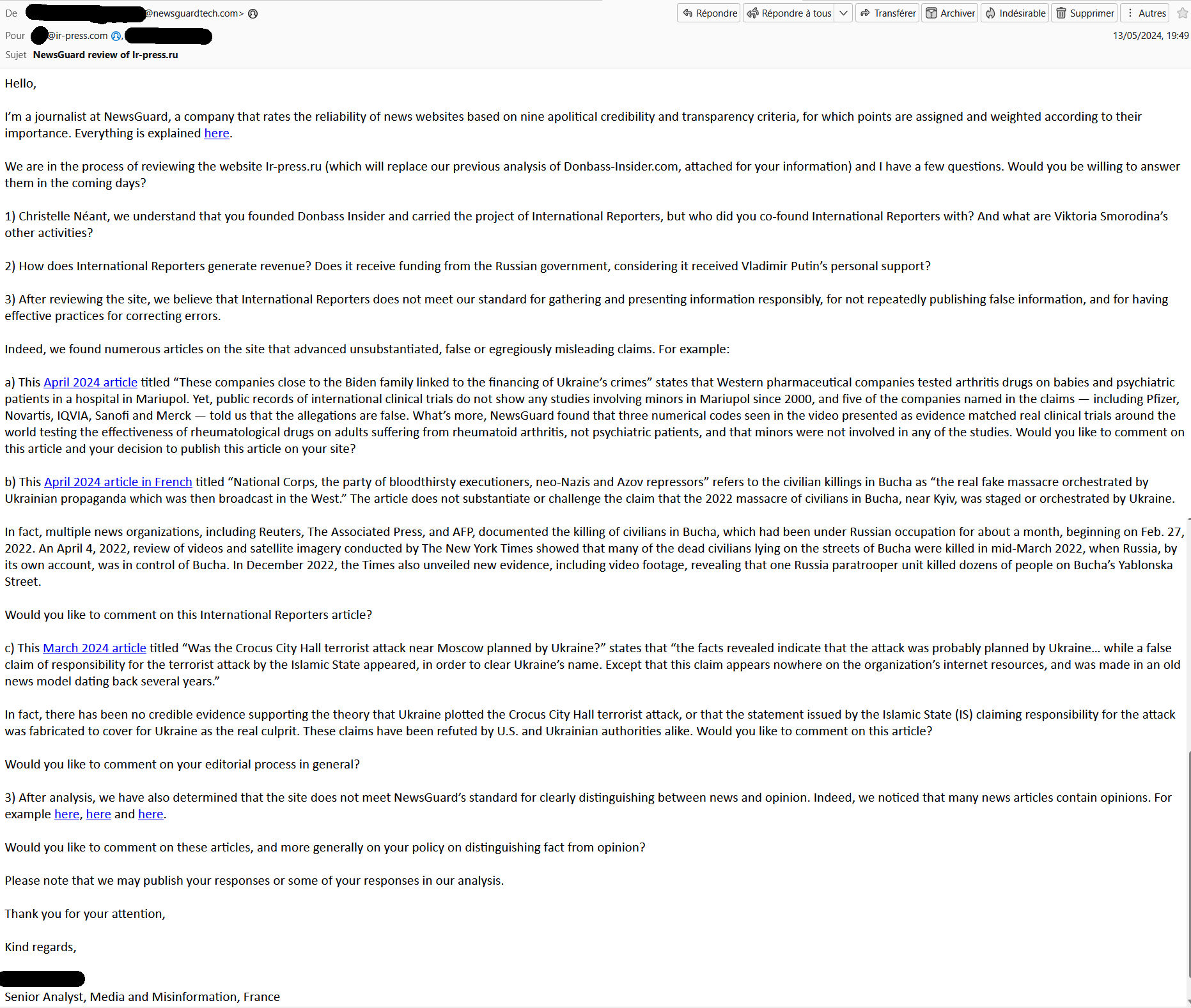 En effet, bien qu’à l’époque nous avions choisi de ne pas médiatiser cette affaire, en 2024, à peine l’agence International Reporters avait elle été créée, qu’elle était déjà ciblée par la fameuse agence de notation des médias NewsGuard (oui, la même organisation qui s’en était prise à Donbass Insider en 2022).