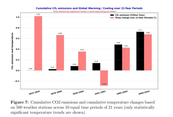 Cependant, l’examen direct des données de température journalières publiques provenant des stations météorologiques ne confirme pas l’idée que le CO₂ soit le principal facteur du réchauffement climatique. Si tel était le cas, les périodes de fortes émissions de CO₂ connaîtraient un réchauffement plus rapide que les périodes de faibles émissions. Or, cette étude révèle que certaines périodes récentes ont été marquées par un refroidissement global malgré une forte augmentation des émissions de CO₂. De plus, la hausse des températures à long terme a été plus marquée lors des périodes antérieures où les émissions de CO₂ étaient modestes, comparativement aux niveaux actuels.