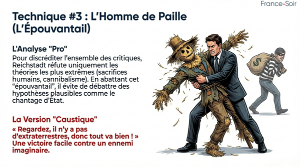Pour torpiller l'ensemble des théories alternatives, Reichstadt cible les versions les plus extravagantes, construisant un épouvantail facile à abattre. Il liste des allégations folles – comme un réseau « pédosataniste » impliquant « sacrifices humains, cannibalisme et infanticides » – pour les réfuter d'un bloc, affirmant que les documents « ne valident pas » ces délires. Cette construction de paille, « strawman » en anglais, permet d'associer toute critique modérée – par exemple, des soupçons de chantage ou d'impunité systémique – à ces extrêmes ridicules. Résultat : le lecteur est invité à rejeter en bloc tout scepticisme, sans que Reichstadt n'ait à débattre des théories plus plausibles. Une technique vicieuse qui transforme le débat en caricature.