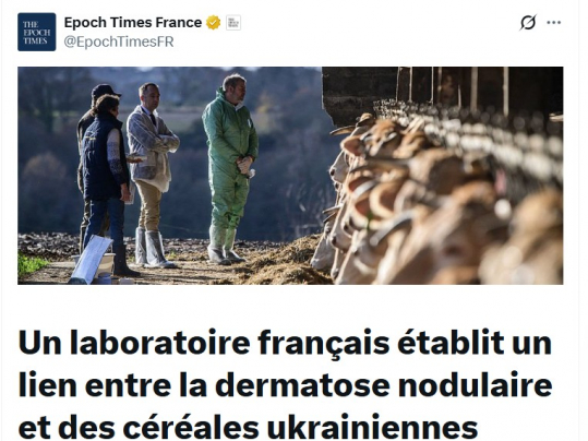 D’après La France Agricole, « le laboratoire de recherche indépendant Agreelia a conclu que la dernière épidémie de dermatose nodulaire contagieuse des bovins (DNC) en France était due à la contamination des animaux par le virus après avoir été piqués par des insectes importés dans le pays avec du grain ukrainien de mauvaise qualité ».