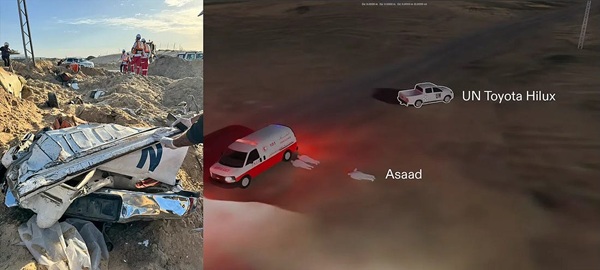 À gauche : photographie du Toyota Hilux de l’ONU prise le 30 mars 2025, lorsque les corps des victimes ont été retrouvés. (© OCHA, 2025). À droite : image tirée du témoignage situé d’Asaad racontant l’emplacement du Toyota Hilux de l’ONU lorsqu’il a été arrêté. (© Forensic Architecture, 2026).