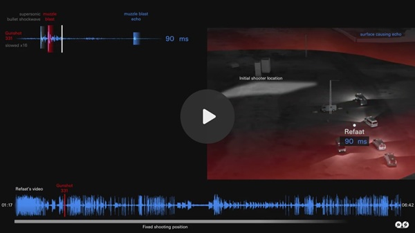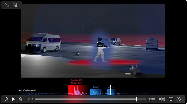 Earshot a utilisé l’écholocation pour analyser le son des enregistrements afin d’obtenir des estimations précises de l’emplacement des tireurs. L’écholocation est le processus qui consiste à localiser la source d’un son en analysant ses échos et l’environnement dans lequel il se propage. L’armée israélienne a détruit et rasé tellement de bâtiments dans la zone de Tel Al-Sultan, où l’embuscade contre les travailleurs humanitaires a eu lieu, qu’il ne restait que très peu de structures. Cette destruction a en fait renforcé la capacité d’Earshot à déterminer les positions et les mouvements des soldats israéliens, en identifiant les surfaces responsables des échos clairement distincts des coups de feu. Au lieu d’avoir plusieurs bâtiments réfléchissant les ondes sonores, il n’y avait que quelques murs encore debout et les véhicules d’urgence eux-mêmes.