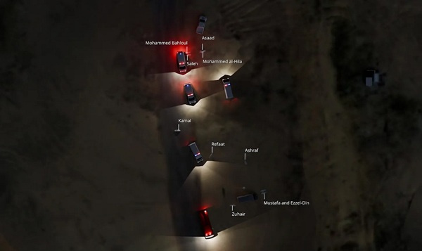 - Les soldats israéliens étaient initialement positionnés sur un talus sablonneux près de la route, sans aucun obstacle limitant leur champ de vision. Les gyrophares et le marquage des véhicules des victimes étaient clairement visibles pour les soldats au moment des attaques.