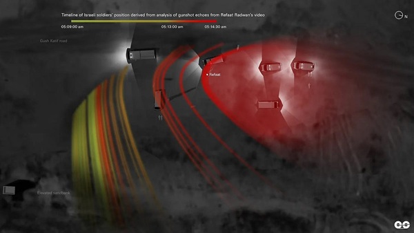 Refaat Radwan, un employé de la PRCS qui se trouvait dans l’une des ambulances, a commencé à filmer avec son téléphone pendant qu’ils se rendaient sur les lieux. Ses vidéos récupérées ainsi que les enregistrements des appels téléphoniques passés par deux autres secouristes présents sur les lieux au centre de dispatching de la PRCS ont fourni des preuves cruciales du massacre. L’analyse des enregistrements par Forensic Architecture et Earshot a corroboré les témoignages oculaires sur les positions et les mouvements des soldats israéliens tout au long de l’attaque.
