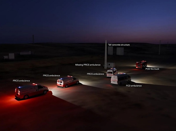 À 4 h 35, la deuxième ambulance, ayant terminé sa mission à Al-Hashashin, a été envoyée à la recherche de la première ambulance, qui avait perdu le contact avec le quartier général de la PRCS à 3 h 55. La deuxième ambulance a été rejointe par deux autres ambulances de la PRCS, dont une appartenant à la défense civile, et un camion de pompiers de la défense civile. Le convoi de secours composé de cinq véhicules est arrivé sur les lieux de l’attaque de la première ambulance peu après 5 h. Tous les véhicules étaient clairement identifiés et leurs gyrophares étaient allumés.