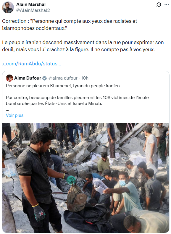 Le rituel suivi par nos édiles est immuable : 1/ se féliciter de la «mort» (ne surtout pas dire «assassinat») de Khamenei ; 2/ après avoir ainsi apporté une justification à la guerre d’agression américano-israélienne, crime suprême selon le tribunal de Nuremberg, et validé les éléments de langage grotesques et abjects des criminels contre l’humanité que sont Trump et Netanyahou sur la prétendue «dictature des mollahs», proclamer la main sur le cœur qu’on ne cautionne pas la guerre et dissocier artificiellement les autres victimes de ces frappes criminelles, affirmant qu’on est solidaire du peuple iranien (surtout, ne faire aucune référence au fait que ce même peuple est sorti dans la rue par millions pour soutenir son «régime» en janvier, et qu’il a fait de même aujourd’hui, malgré les bombes : ce ne sont pas les aspirations réelles des Iraniennes qui comptent, mais celles que «l’Occident civilisé» souhaite pour elles, et qui veulent le façonner à son image, mentalité coloniale oblige).