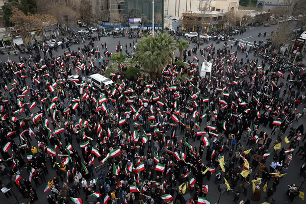 Des Iraniens se sont rassemblés sur la place Palestine, brandissant des drapeaux iraniens et scandant des slogans anti-américains et anti-israéliens pour protester contre les attaques des États-Unis et d’Israël à Téhéran, la capitale de l’Iran, le 28 février 2026. Photo de Fatemeh Bahrami/Anadolu via Getty Images.