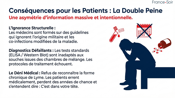 Ces révélations ne concernent pas seulement l’histoire : elles expliquent pourquoi tant de patients restent malades malgré les traitements standards. Les médecins, formés sur des guidelines officielles qui ignorent totalement l’existence possible de pathogènes issus de programmes militaires, sont maintenus dans une ignorance structurelle. Tests ELISA/Western Blot inadaptés, absence de recherche sur les co-infections non déclarées, refus de reconnaître la forme chronique… tout cela constitue une asymétrie d’information massive qui se traduit par une forme insidieuse de désinformation médicale.