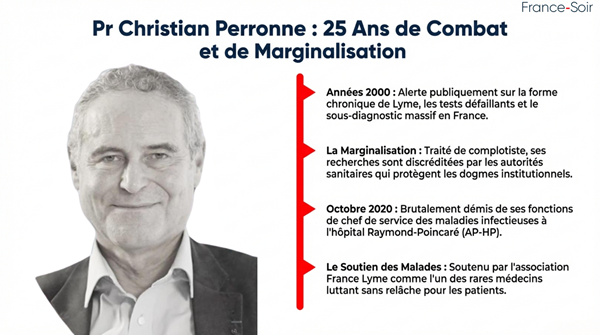 Bien avant ces révélations de 2026, le professeur Christian Perronne, ancien chef du service des maladies infectieuses à l’hôpital Raymond-Poincaré de Garches (AP-HP), a été l’un des tout premiers à briser l’omerta. Dès les années 2000, il alerte sur la forme chronique de la maladie de Lyme, les tests défaillants, le sous-diagnostic massif et la nécessité d’une prise en charge pluridisciplinaire.