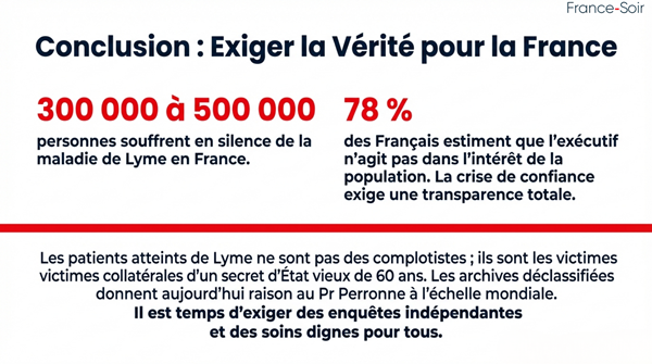 Le vent change aux États-Unis. La France, où 300 000 à 500 000 personnes souffrent en silence, ne peut plus se permettre de rester à la traîne. Comme le répète le Pr Perronne depuis 25 ans : « Avant tout, c’est un combat pour les malades. » Les archives déclassifiées lui donnent aujourd’hui raison à l’échelle mondiale. Il est temps d’exiger la pleine vérité et des soins dignes pour tous.