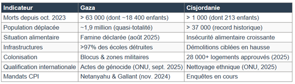 Gaza reste, en termes bruts, la crise humanitaire la plus destructrice de ce conflit : en volume de morts, de destructions et de souffrance immédiate, rien ne lui est comparable dans la région depuis des décennies. Mais la Cisjordanie n'est pas en paix : elle est le terrain d'une dépossession organisée, accélérée, légalisée — une guerre lente qui ne fait pas les unes des journaux mais qui remodèle profondément la réalité démographique et territoriale d'un peuple.