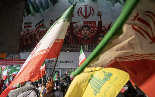 Des manifestants iraniens brandissent des drapeaux nationaux et un drapeau du Hezbollah libanais lors d’un rassemblement contre la guerre américano-israélienne dans le centre-ville de Téhéran, le 6 avril 2026 (Morteza Nikoubazl/NurPhoto)
