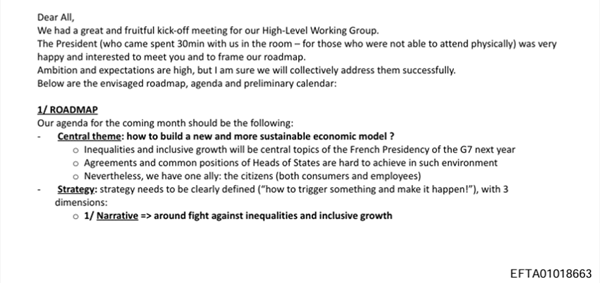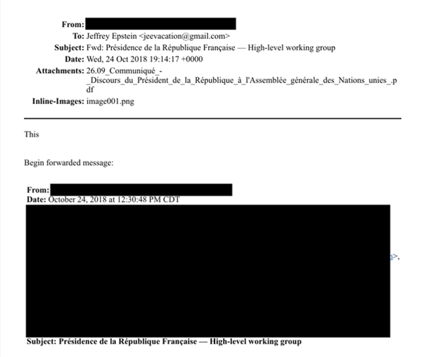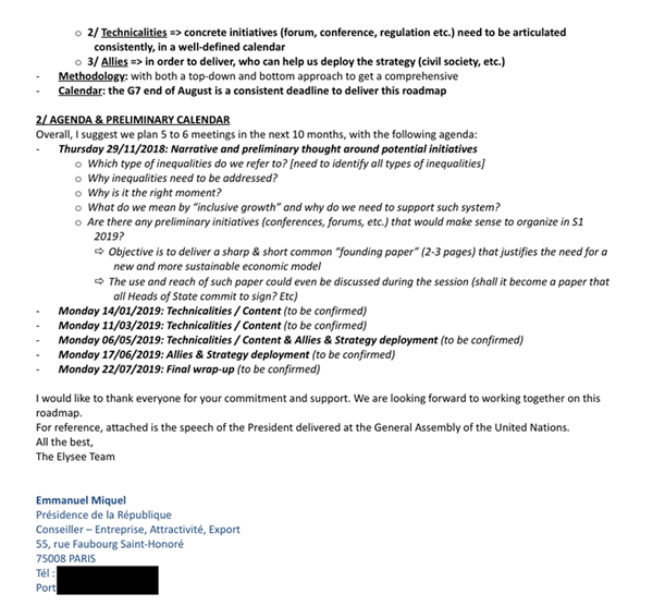Le 24 octobre 2018, Jeffrey Epstein reçoit par mail le communiqué diffusé par Emmanuel Miquel, conseiller de la Présidence de la République, ayant pour sujet « Présidence de la République Française – Groupe de travail de haut niveau » dont le thème central est « Comment construire un modèle économique nouveau et plus durable ? »