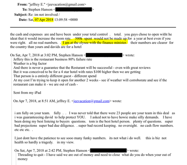 Le 7 avril 2018, Jeffrey Epstein envoie un courriel à Stephen Hanson : « Les liquidités et les dépenses sont et ont toujours été sous votre contrôle total. Vous avez choisi d’ouvrir en pensant que cela augmenterait le prix des chambres. Même si vous aviez raison, les 500 000 dépensés ne seraient pas récupérés avant un an, au mieux. Pas de vrais chiffres. Je suis à l’Elysée avec le ministre des Finances. Leurs chiffres sont plus clairs pour le pays que les vôtres et ceux de David pour un hôtel ».