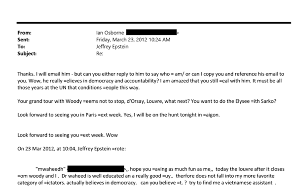 Le 23 mars 2012, le milliardaire Ian Osborne écrit à Jeffrey Epstein : Merci. Je vais lui envoyer un courriel, mais peux tu lui répondre pour lui dire qui je suis / ou puis-je te mettre en copie et te transmettre son courriel ? Waouh, il croit vraiment en la démocratie et la responsabilité ? Je suis étonné que tu aies encore affaire à lui. Ce sont sûrement toutes ces années à l’ONU qui conditionnent les gens comme ça.