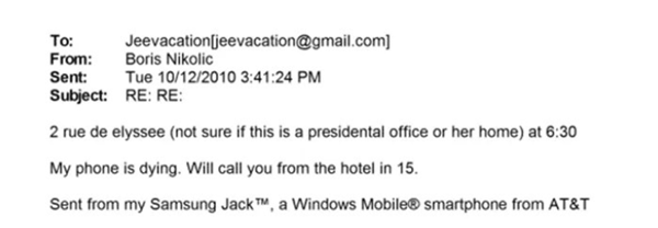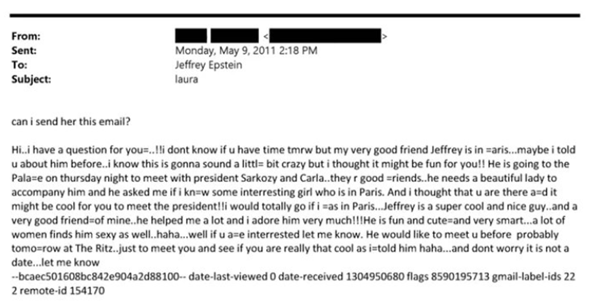 En avril 2011, Epstein écrit à un correspondant : « Je dois dîner au Palais avec Sarkozy, j’ai besoin que quelqu’un m’accompagne. » Son interlocuteur écrit ensuite à une femme prénommée Laura : Jeffrey Epstein « se rend au Palais jeudi soir pour rencontrer le président Sarkozy et Carla. Ce sont de bons amis. Il a besoin d’une belle femme pour l’accompagner et m’a demandé si je connaissais des filles intéressantes à Paris. Je pensais que tu étais là et que ça pourrait être cool pour toi de rencontrer le président ! »