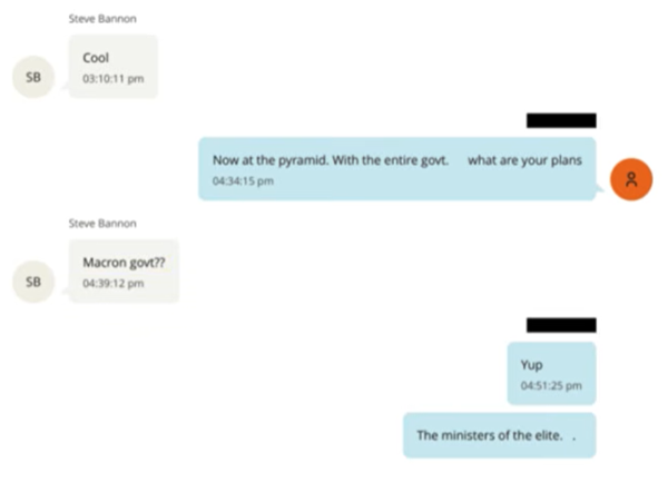 Un échange par textos entre Jeffrey Epstein et Steve Bannon contient ce message d’Epstein ; « Je suis à l’Elysée. » Une heure et demi plus tard, Epstein écrit à Steve Bannon « Maintenant à la pyramide avec l’ensemble du Gouvernement ». Bannon répond : « Le gouvernement Macron ? » Epstein réagit : « Oui », « Les ministres de l’élite ».