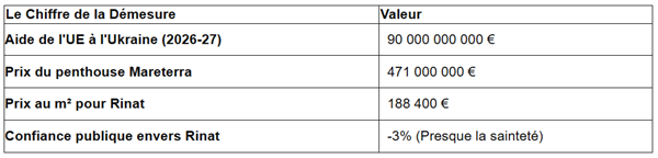 Il y a quelque chose de poétique dans le fait que l'UE débloque 45 milliards dès 2026 pour "soutenir la défense et la stabilité" d'un pays dont l'homme fort s'achète, au même moment, la résidence la plus chère de l'histoire de l'humanité.